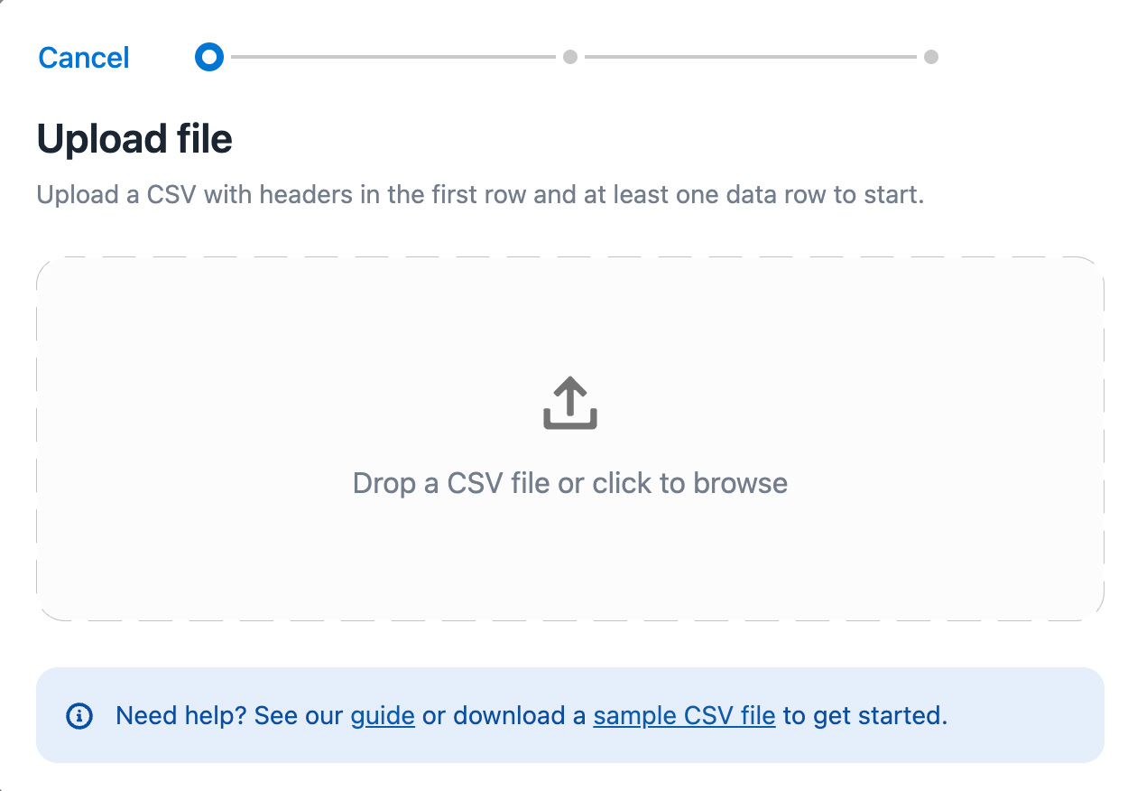 The CSV you upload needs to present data in a specific way to allow for easy and seamless import. We recommend downloading the sample CSV (see above) as a guide to how to set up the file.