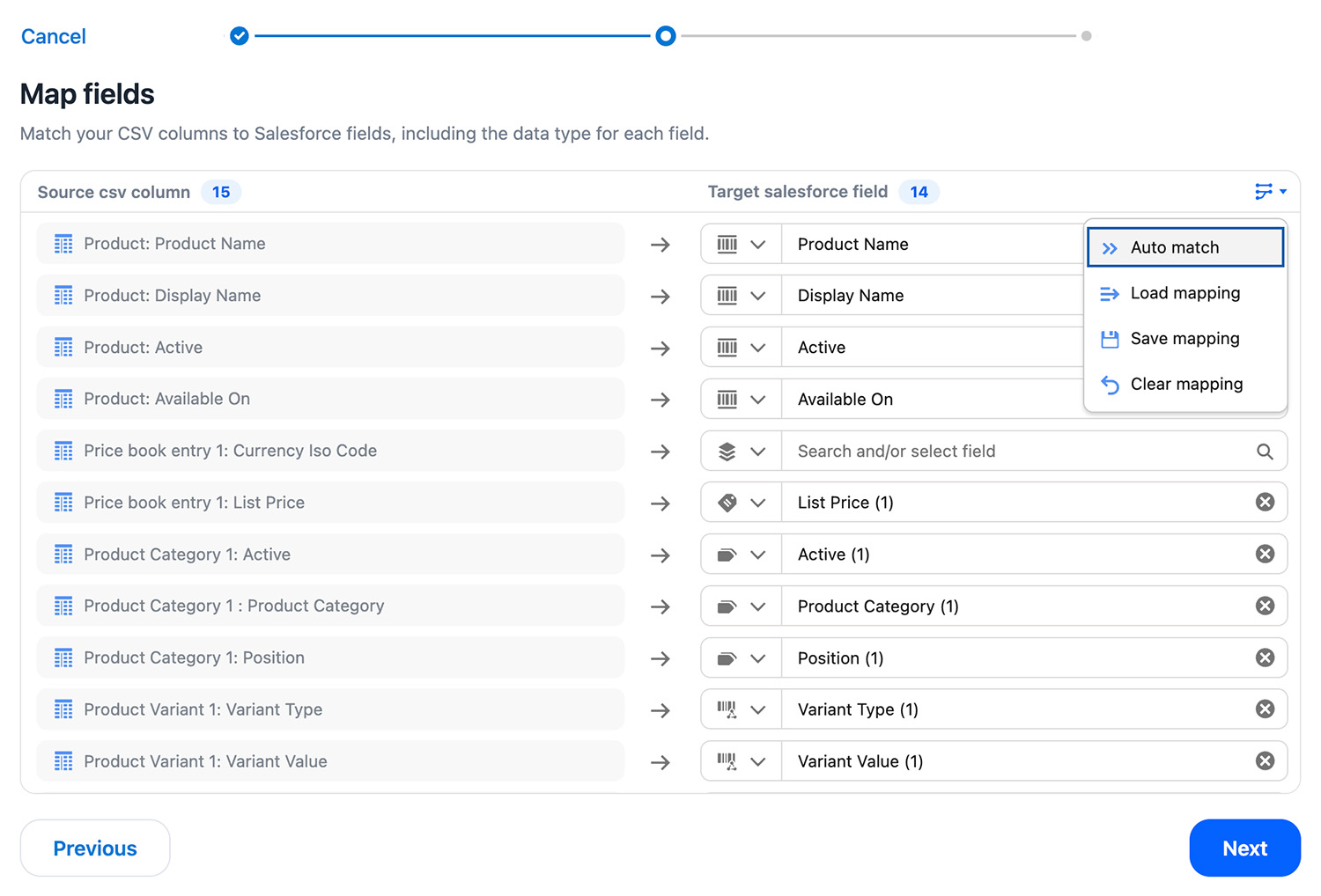 - Auto match - attempts to automatically link all columns to their recognized Salesforce field