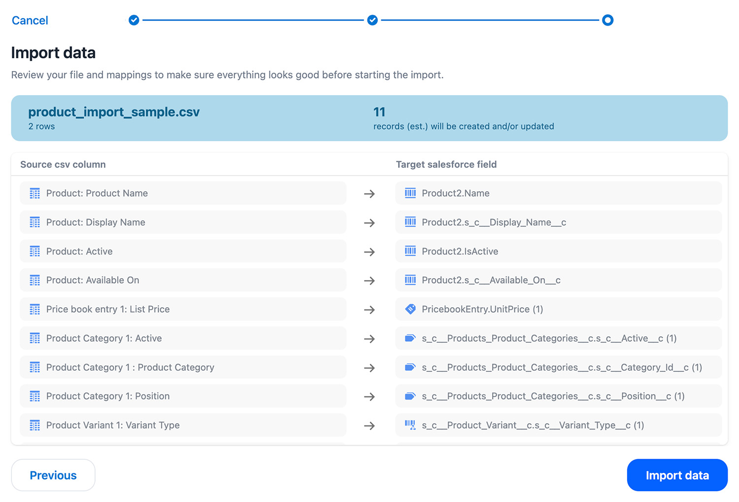 - When everything is mapped, select Import data. Any columns that can't be mapped to a Salesforce object field will not be included in the import. Import time depends on the number of records within the CSV file, but doesn't generally take long.
