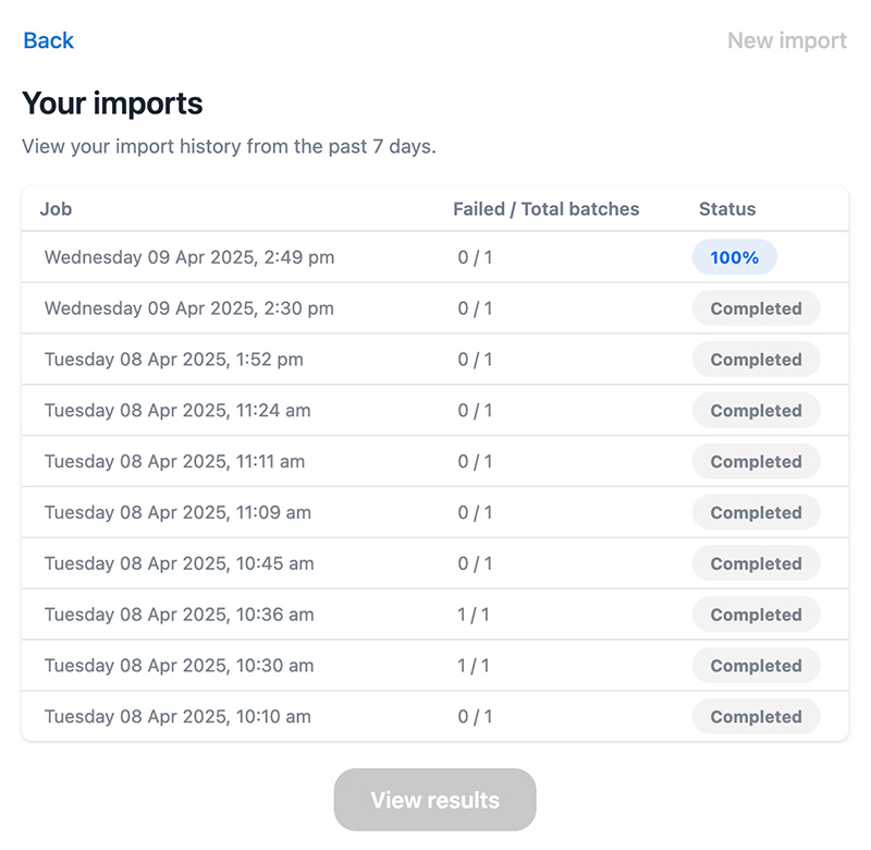 - The Your Imports screen appears when the job is running, and you can click View Results when the job is finished. The results screen shows the files list of all Success and Error logs for every import. Here you can download and view the complete status of every import.