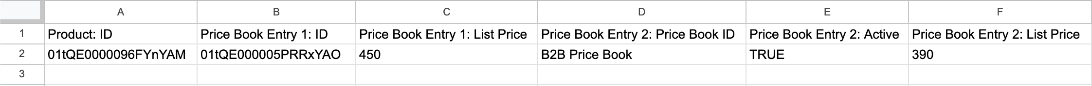 - Add a column to the CSV for the Product: ID. This is the unique identifier for the product in Salesforce. You need to include the Product ID of existing products, otherwise a new ID will be generated and you may end up with duplicate records.