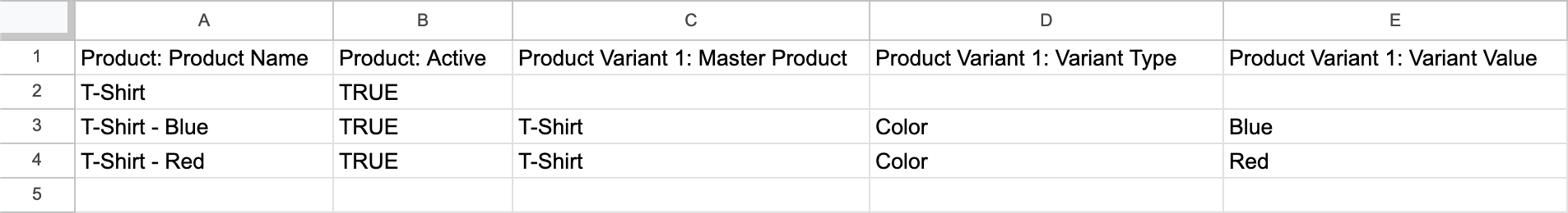 For Variant products you will need to indicate the master product, simply include the Name of the Master product as in this example: